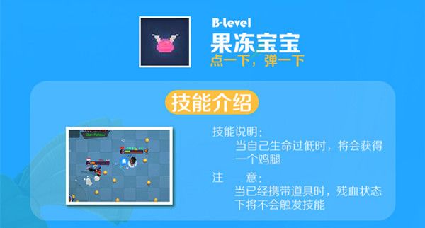 能令携带者在生命值过低的时候,获得一个道具——鸡腿,在不被打断恢复效果的情况下鸡腿能令使用者恢复大量的生命,让你成为游戏中最难啃的那根骨头!但是要注意的是,当玩家已经携带道具时,果冻宝宝将不会发动技能效果,也就是说鸡腿不会以平常形式上的那样直接使用,而是会消失不见,切记切记!