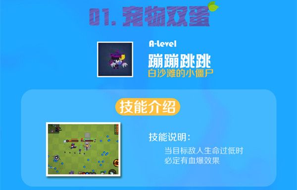 一只来自白沙滩的小僵尸,通过自身的努力终于成长成为了最顶级的存在——蹦蹦跳跳,嗜血的它对于伤上加伤可谓是驾轻就熟,当蹦蹦跳跳一看见伤口,就犹如闻到腥味的鲨鱼兴奋不已,能令携带者自动拥有血爆效果!