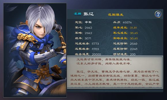 张辽,字文远,是曹操手下五子良将之一,实力非同小可。在游戏中,张辽是每位玩家必定会得到的强力武将,随着剧情的解锁,张辽会作为奖励赠送给每一位玩家。作为一名三星级武将,张辽绝对是前期阵容中的主力输出,横扫千军作为大范围的AOE技能,在战斗中能够给予对方重创,并且自身的成长潜质也较高,绝对是前期值得培养的武将之一。
