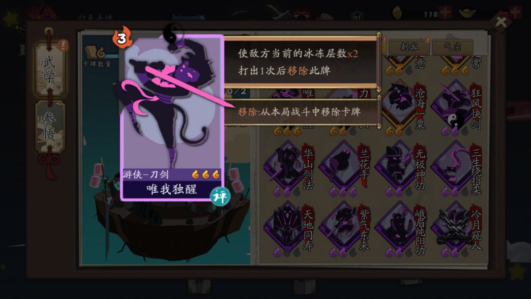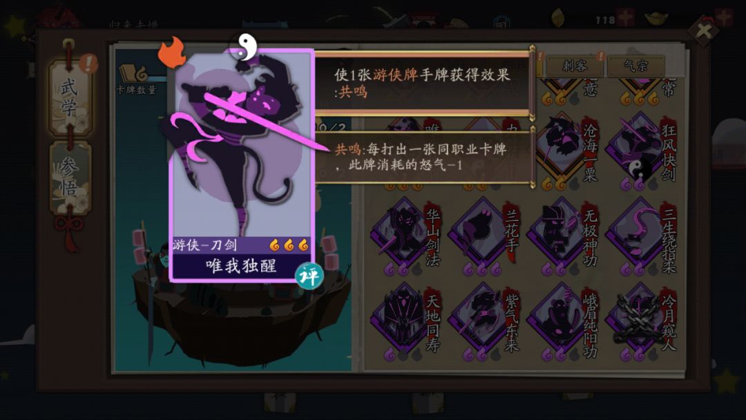 视频卡组可能不太一样,我是比较非就拿到利剑无意。(这里也有一个小的思路,把无形剑气先打出虽然一开始没有2连击的伤害,但是后面利剑无意打出的都是带连击的无形剑气,一张利剑无意打出一张无形剑气加上狂风刀法抽上来的无形剑气,伤害可观。),新手拿唯我会容易很多,效果也会更好。
