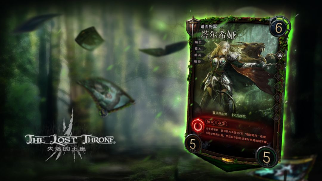 塔尔希娅是一张拥有6费用4自由科技,5/5身材哨兵,统帅特征的近战森木精灵英雄。并拥有一个卡牌效果。