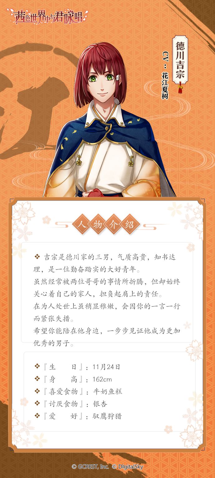 吉宗是德川家的三男,气质高贵,知书达理,是一位勤奋踏实的大好青年。