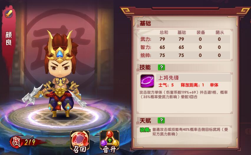 总结,颜良虽有勇无谋,但确为先锋上将合适人选,玩家将其培养为顶级后,实为击倒小能手,妥妥的物理击倒流必备之先锋。