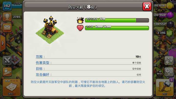 3:防空火箭是COC中非常重要的“单体防空”建筑(4本解锁,上限4个),这个建筑在对空上的强度非常大,且只会攻击对手空中的敌军,是空军流派的克星。阵型使用上多放置在阵型靠近中外侧的位置。