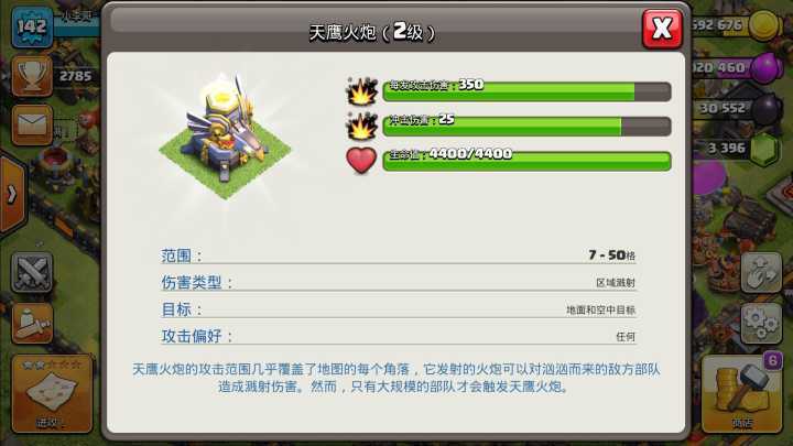 5.天鹰火炮是COC中最为大型的“综合溅射”防守建筑(11本解锁,最多1个),该建筑在开局阶段不会发起进攻,只有进攻部队达到180人口后才会被触发,使用上多放置在重要核心位置,属于C位防守建筑。