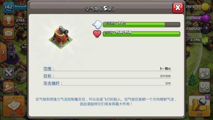 4.空 气 炮是一个很特殊的“辅助控制”类防守建筑(7本解锁,上限2个),建筑虽然不具有伤害性,但是可以击退敌军空军的部队,配合防空火箭的对空能力很出色。
