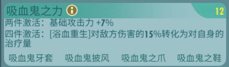 吸血鬼之力主属性头部:攻击力 暴击值手部:攻击力 暴击值胸部:暴击值 生命值脚部:攻击力 生命值套装属性