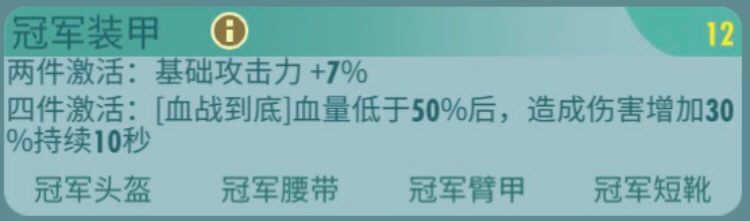 冠军装甲主属性头部:能量抗性 物理抗性手部:攻击力 暴击值胸部:能量抗性 物理抗性脚部:生命值 闪避值套装属性