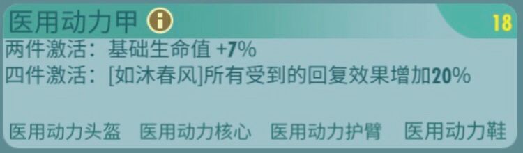 医用动力甲主属性头部:能量抗性 物理抗性手部:攻击力 暴击值胸部:物理抗性 能量抗性脚部:生命值 闪避值套装属性