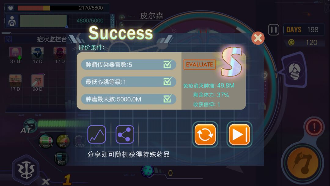 所以我们先不急着手术,第11-12天,也是游戏里day剩余198-199左右,等癌细胞下降到1030m左右的时候做手术,手术完直接治愈,s评价
