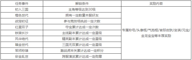 三国纪要展示了少年从初入三国,到如今称雄乱世的多个关键事件,少年们只需完成三国纪要中记载的任务事件,即可领取对应事件的丰厚奖励!且少年们在参与相应玩法时还有怀旧服特权加成哦!