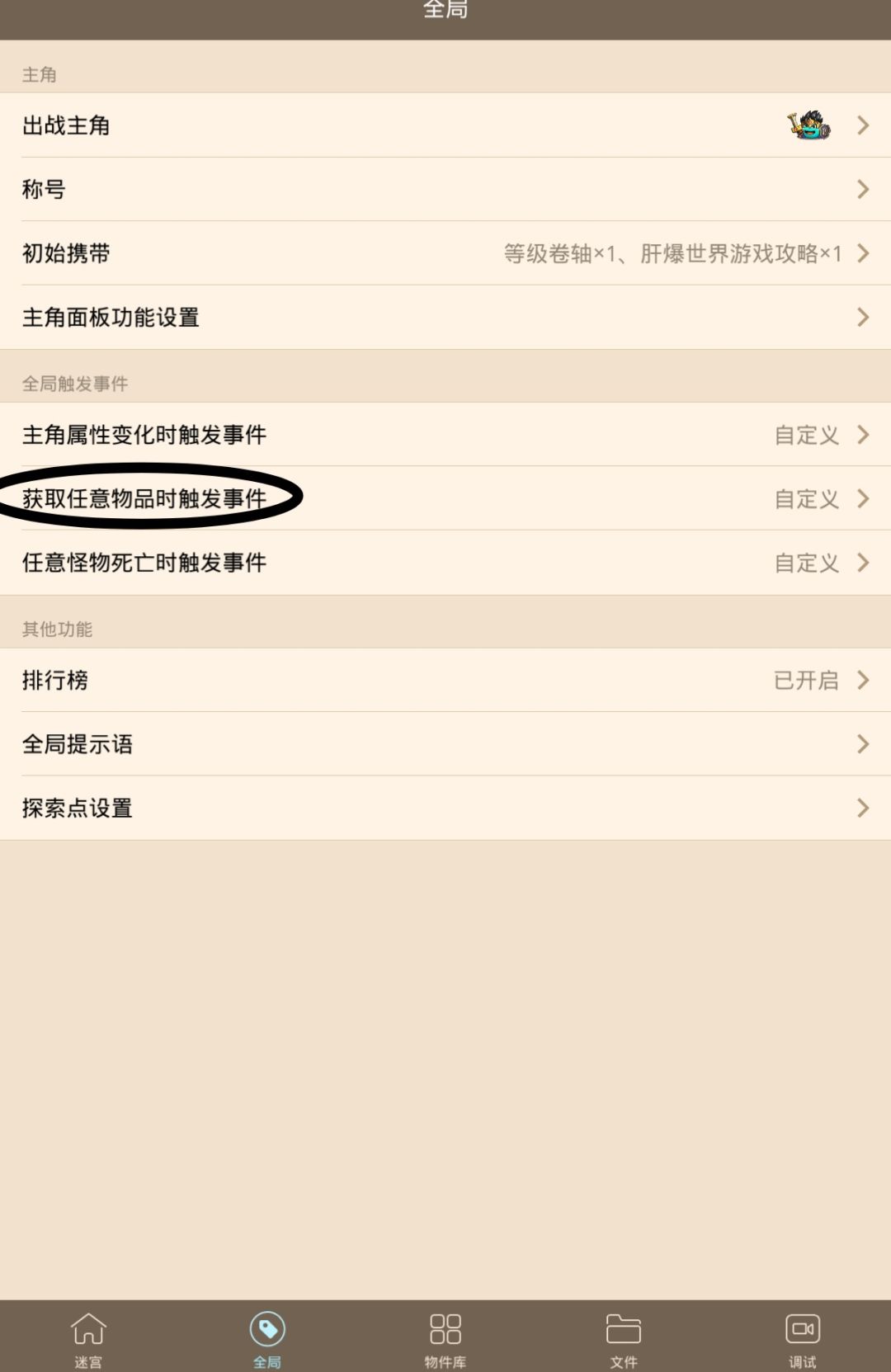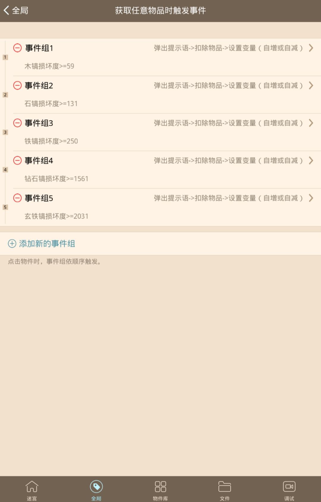 第三步:打开全局,因为这里是挖矿,会获得物品,所以获得任意物品时触发事件可以及时判断损耗度