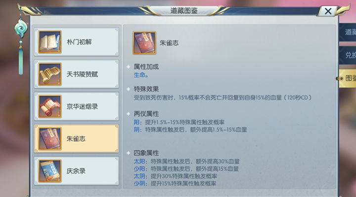 京华迷烟录和朱雀志的基础属性效果都是提高玩家的血量。区别就在于两本道藏特殊效果的不同,影响着两本道藏的效果对玩家自身增益的都是玩家自身的血量,玩家的血量越多,京华迷烟录特殊效果产生的护盾能抵挡的伤害就越多,受到致死攻击,朱雀志特殊效果触发后回复的血量值就越多。两本道藏,一本道藏(京华迷烟录)的触发效果是在攻击过程中,一本道藏(朱雀志)的触发效果在攻击结尾。