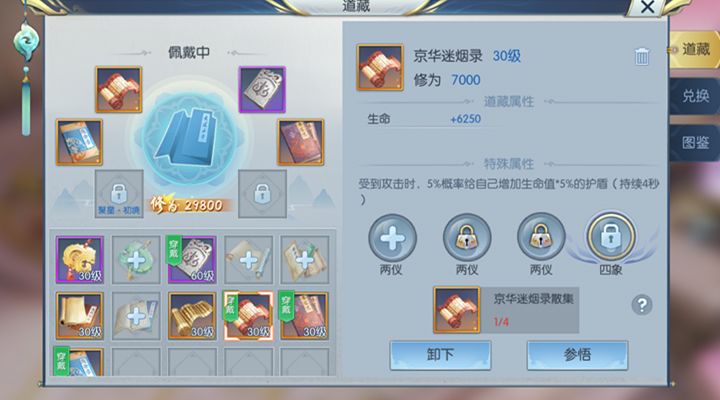 京华迷烟录:提升玩家的生命值,并且在玩家自身受到攻击的时候,有5%的概率给自己增加生命值5%的护盾(持续4秒)。