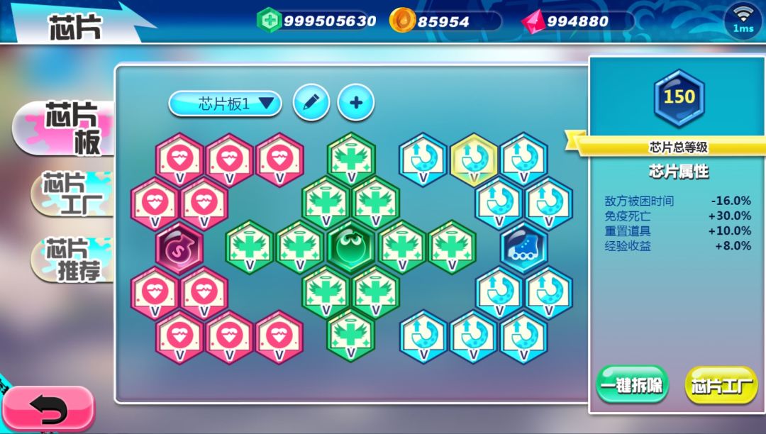 可以看到这套芯片提供30%的概率免疫死亡,减少对方16%敌方被困时间,10%的概率重置道具,增加8%的经验收益。