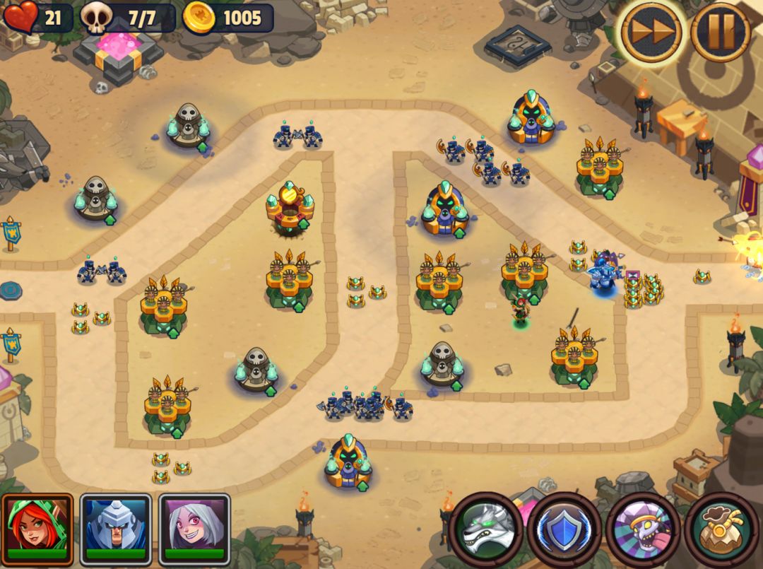 第一波,敌人出口处3个矛塔,右上一个兵,矛塔升到3级,不用开技能,兵营不用升~英雄扎堆放出怪口就好(远程英雄别跟近战英雄站一起)