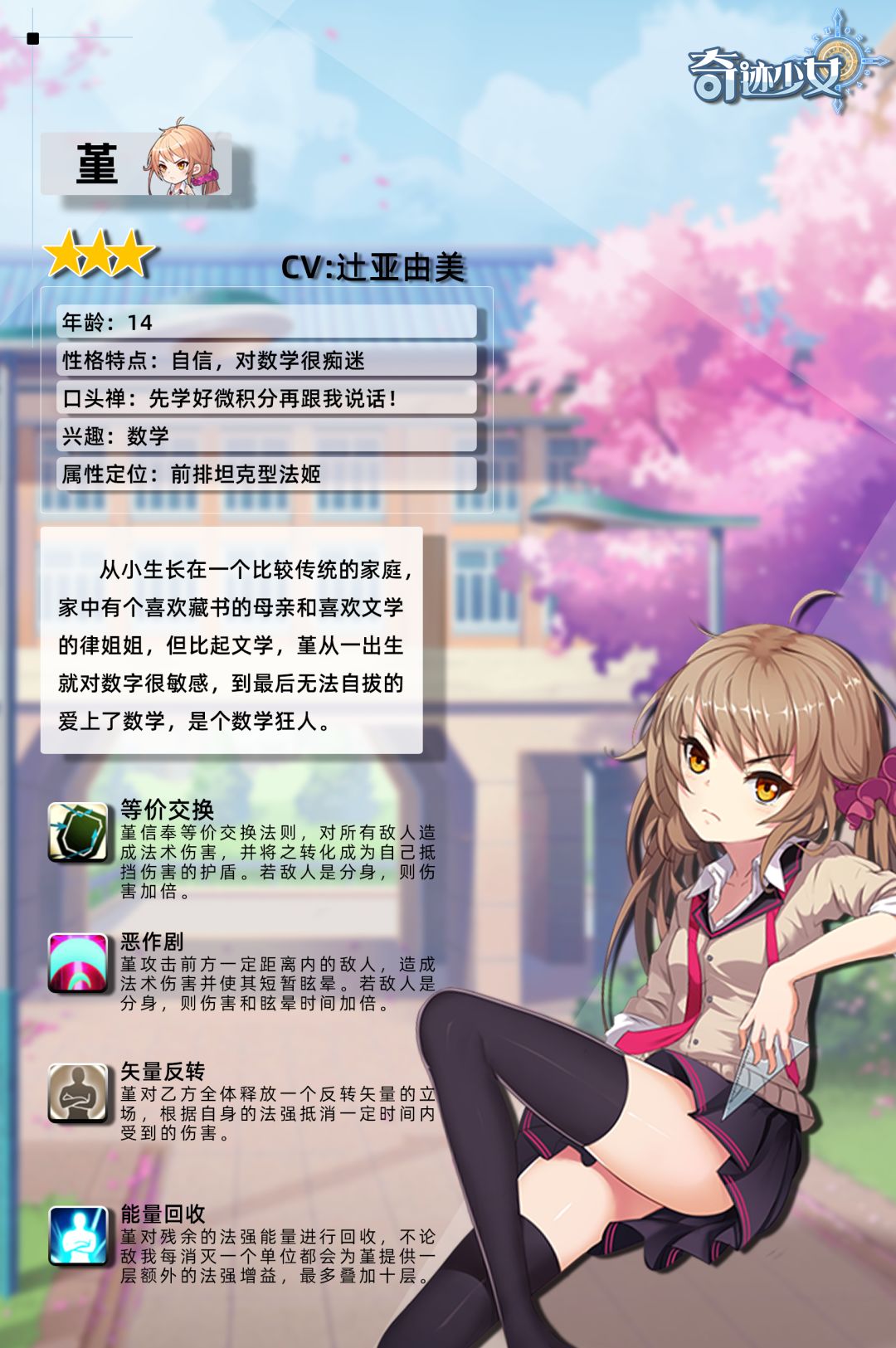 从小受到母亲和姐姐影响的她,对于知识有着天生的渴望与追求,与喜欢文学的姐姐不同,堇最爱与数字打交道,是个不折不扣的数学狂人~