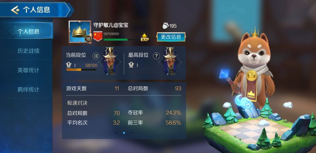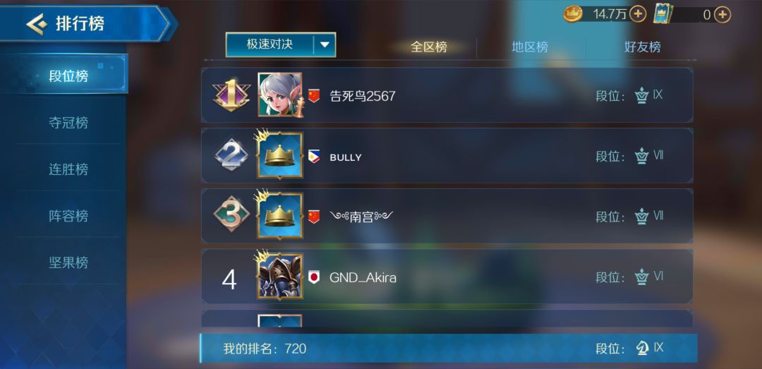 一个自己号,一个女朋友的号(id是我的号去掉守护),全是我玩的,自己号三天就能冲进前200,去玩女朋友的号两天进前600,然后不玩的那个号就被别人挤下去了。 谈谈游戏,最厉害的阵容应该就是6人类6骑士,不过昨天被削了,没有之前那样强势但是还是很牛逼,现在4哥布林和6战士搭配其他有aoe的职业也是可以吃鸡的