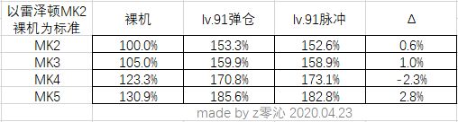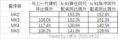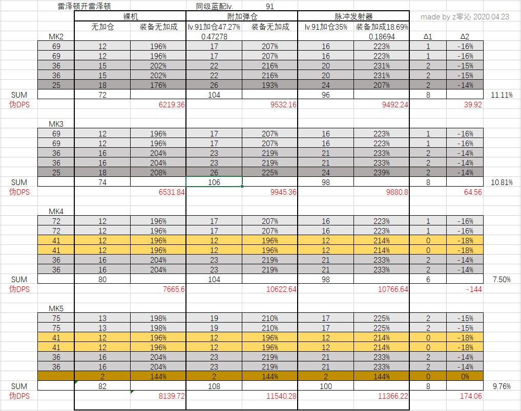 一颗成熟的雷泽顿各个副炮武器装备加成是在300%左右。为了便于计算,所有子弹伤害初始值记为1,不计弹药装填速度。假设相同时间内打出的弹药就是总弹数(都是3段武器位,不计吵吵蜉蝣机)。假设完了后面就是估算数学期望。各个配件发动概率是按射出子弹数而不是按照时间推移,相同时间子弹数越多越好触发的量就大(雷泽顿射得够快)。配件发动概率不用算,因为这是与子弹数成比例的,也就是说带不带其他配件与计算弹仓和脉冲的伤害情况是无关的。具体同样见萌新做的这张表。以MK5弹仓伪DPS为例子,伪DPS=75.*19.*210%+75.*19.*210%+41.*12.*196%+41.*12.*196%+36.*23.*219%+36.*23.*219%=11540.28,其他伪DPS类似,电脑一拖就完事了。然后其他比比对对,萌新又做了下两表。请自行服用。