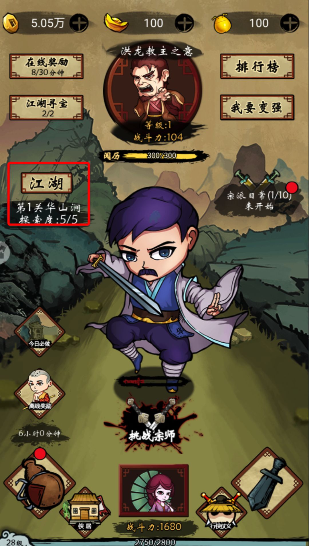 如果出现挂机首页,探索度超过5/5,还不能进入下一关的问题,请点击江湖按钮,切换到前面的关卡打过去,然后就能正常了!