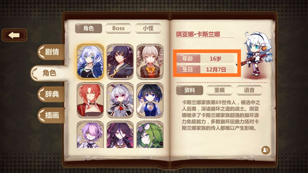 8.崩坏图书馆的妙用。在图书馆中我们不仅可以知道精英技能效果,并且通过人物可以看到人物生日(一般人物up与生日是一致的哟)和人物预设效果。(图为图书馆)