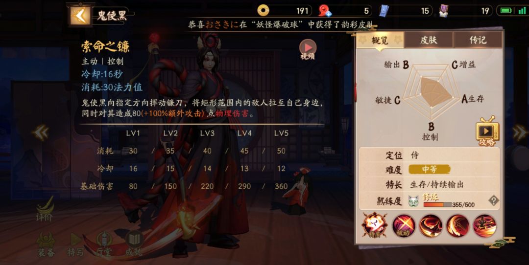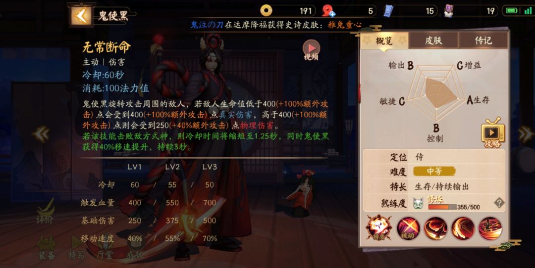 三技能无常断命:小黑挥舞镰刀对范围内式神进行攻击,若生命低于400(+100%额外攻击力)点就会受到即死效果(斩杀真伤),若生命高于400(+100%额外攻击力)受到250(+40%额外攻击力)点物理伤害。即死效果:触发后小黑获得加速,1.25秒后可再次释放该技能。[小黑连招:转转转转转,小黑转的瞬间可以使用闪现(配合起来能转到很远的敌人)]