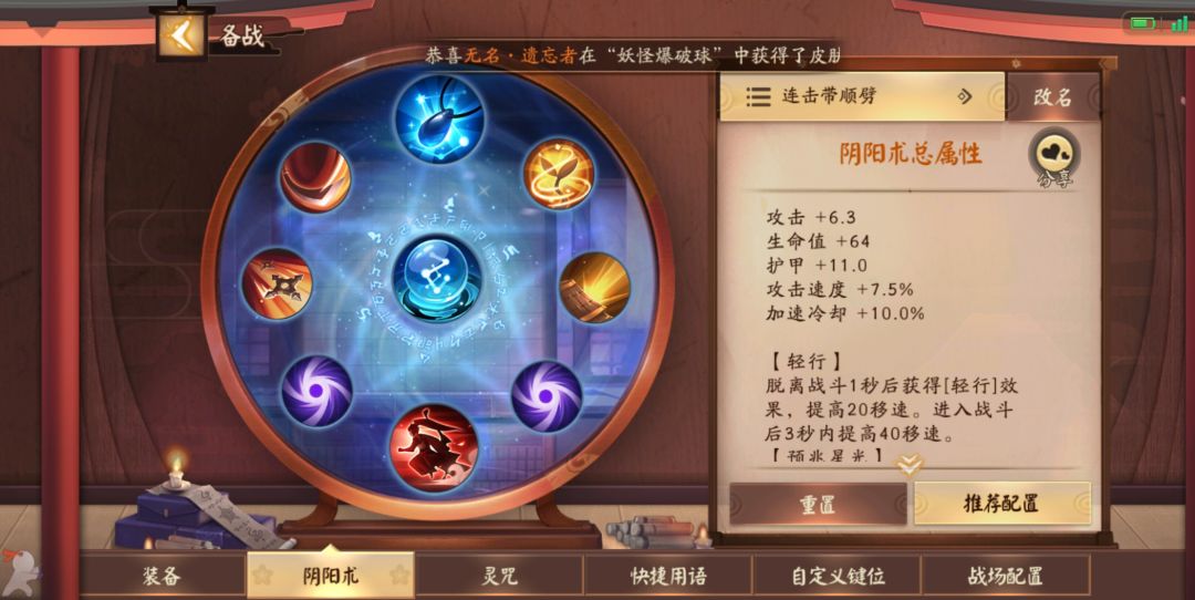 轻行能获得加速便于贴近敌人,用来走位逃跑。