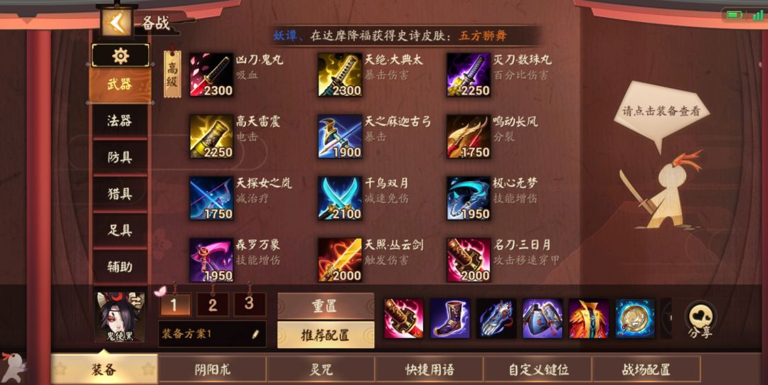 1名刀三日月:600生命值,35攻击力,20%加速冷却。技能网切:20%物理穿透(注不是20点固定,是百分之二十)。技能逐月:每次对敌方式神造成物理伤害叠加6点移速和7点攻击,最大五层。[属性爆高,极其推荐,首件]