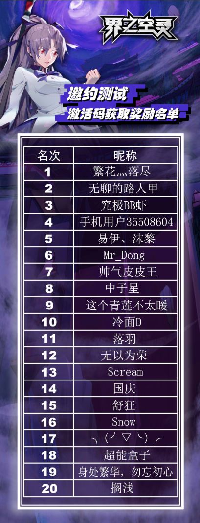 废话不多说,下面奉上《界之空灵》首次邀约测试获奖名单