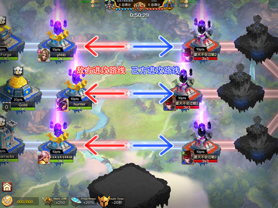 能够到达最终的联盟基地的道路一共有3条,游戏的规则是只有摧毁了道路上的建筑后,才能向与这座建筑相连的其他建筑发起进攻。