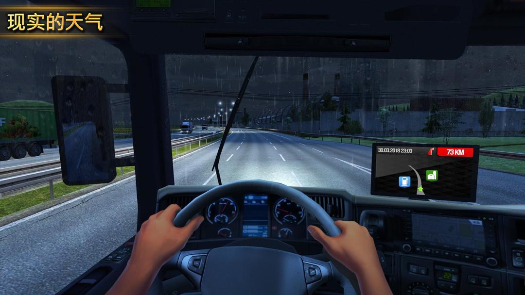 切换到第一人称,打开后视镜,选一个喜欢的电台,启动引擎……你会瞬间迷上开卡车的感觉!游戏模拟的环境极为逼真,晚上可以打开大灯,下雨时开雨刷,转弯能打转向等,后视镜里擦身而过的汽车、围栏让人时刻提心吊胆,即使是直行,也一点都不敢马虎。