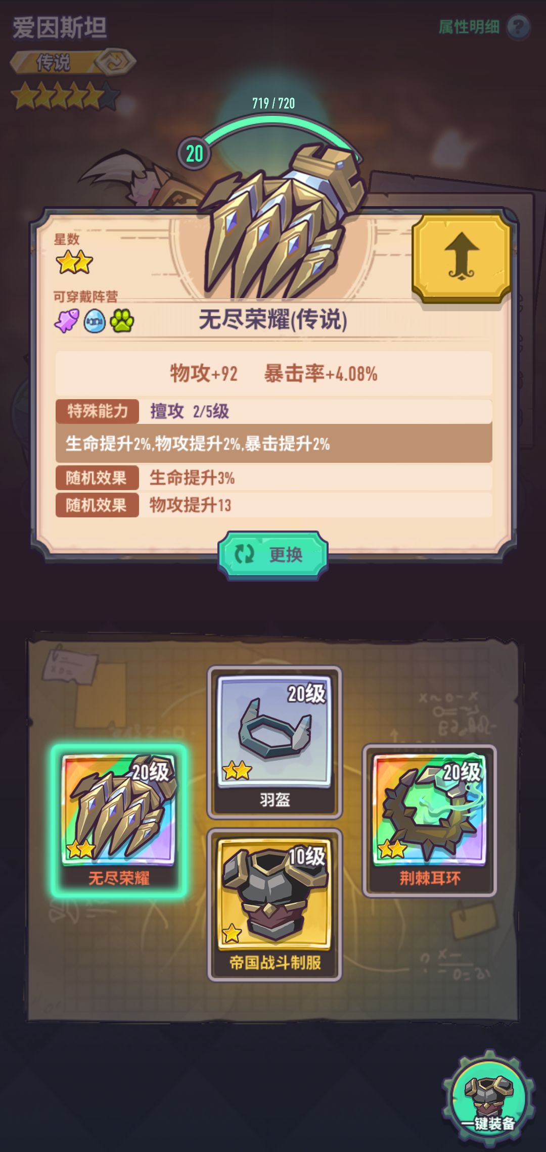没有一身好装备的骑士怎么能算的上骑士呢,我们加入了装备体系,其中包括了装备获得和装备成长。高级的装备都拥有特别的效果,适合不同的骑士。有的装备甚至可以改变整个战斗的规则。来探索和发现这些装备吧。