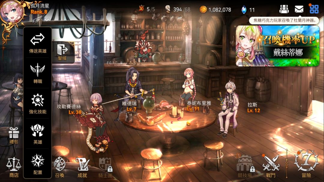 这里其实就一目了然了。每个英雄都需要穿戴装备,装备可以通过冒险刷出来。装备分为:武器、头戴、护甲、鞋子、项链、戒指。而右上角那个六边形的框则是神器。不同的神器所带来的效果也各不相同。当然,肯定还是星级越高就越好(滑稽