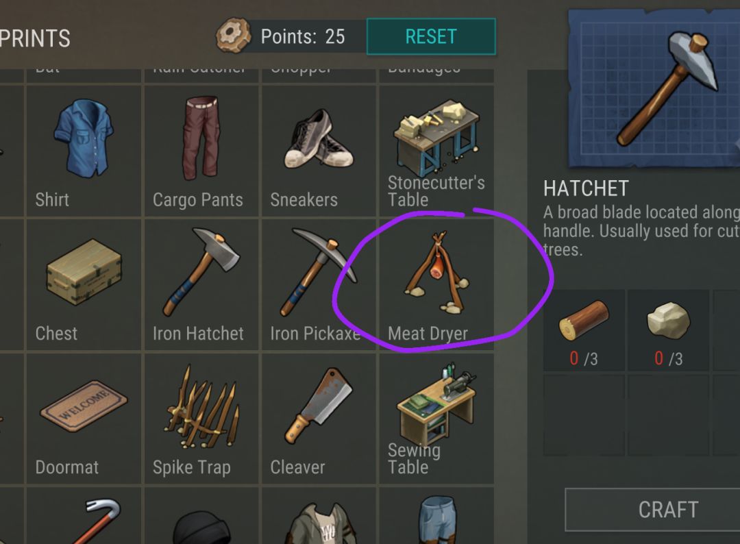 肉块(靠杀狼,鹿获得)就这么吃太浪费了所以做一个晒肉架,晒成肉干(或者用锅做成肉排)