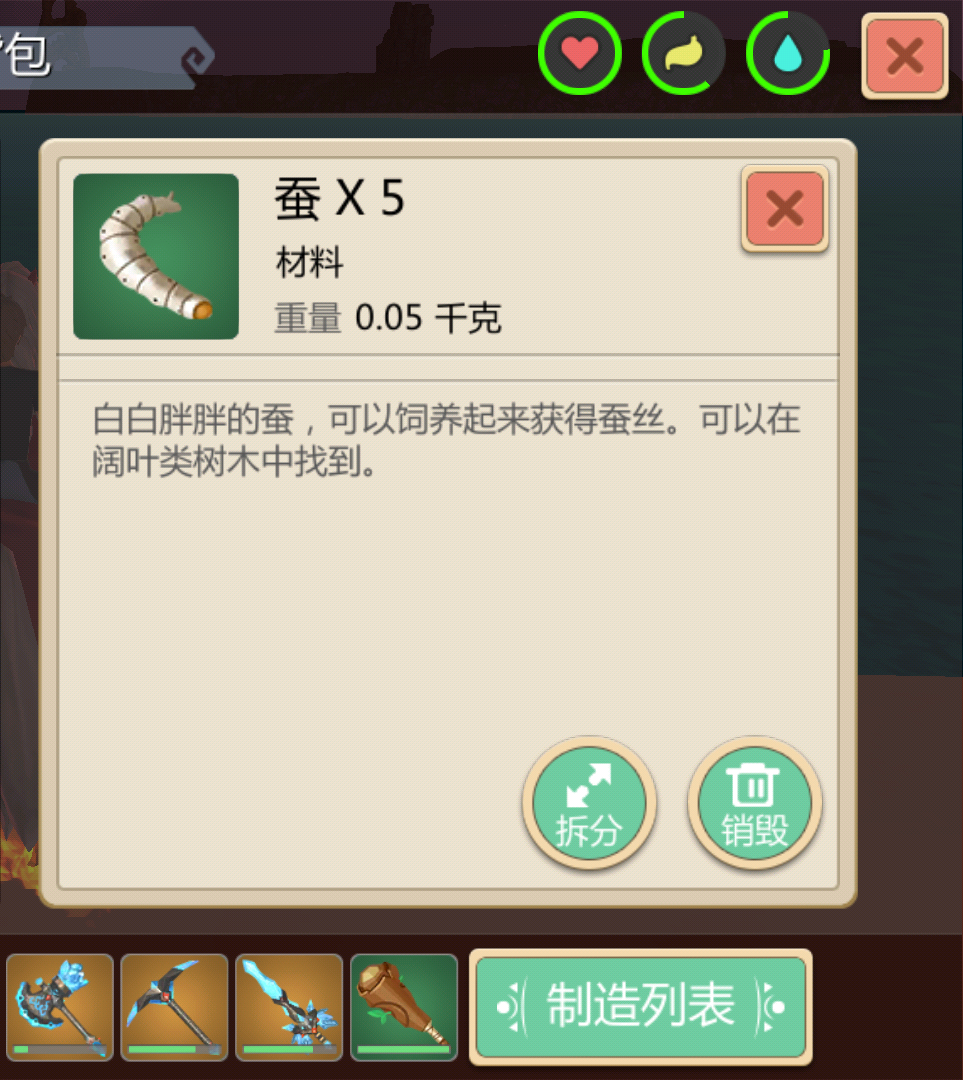 橡胶树有几率掉落蚕丝和树叶,树叶是喂养蚕的