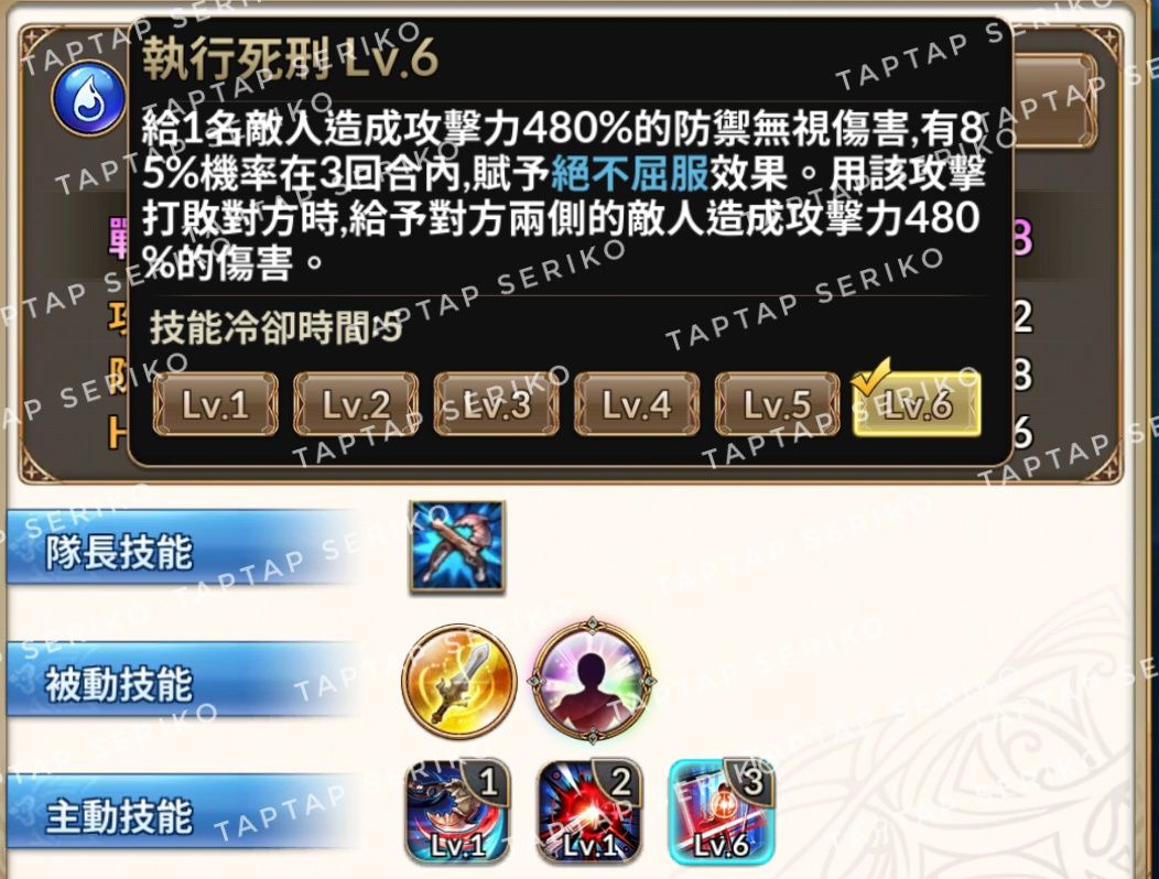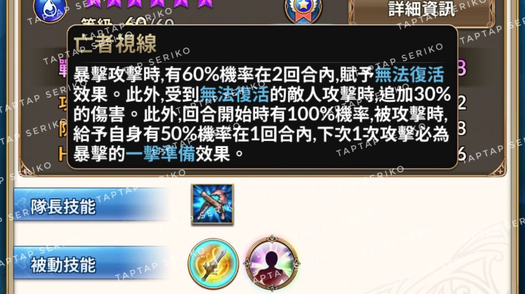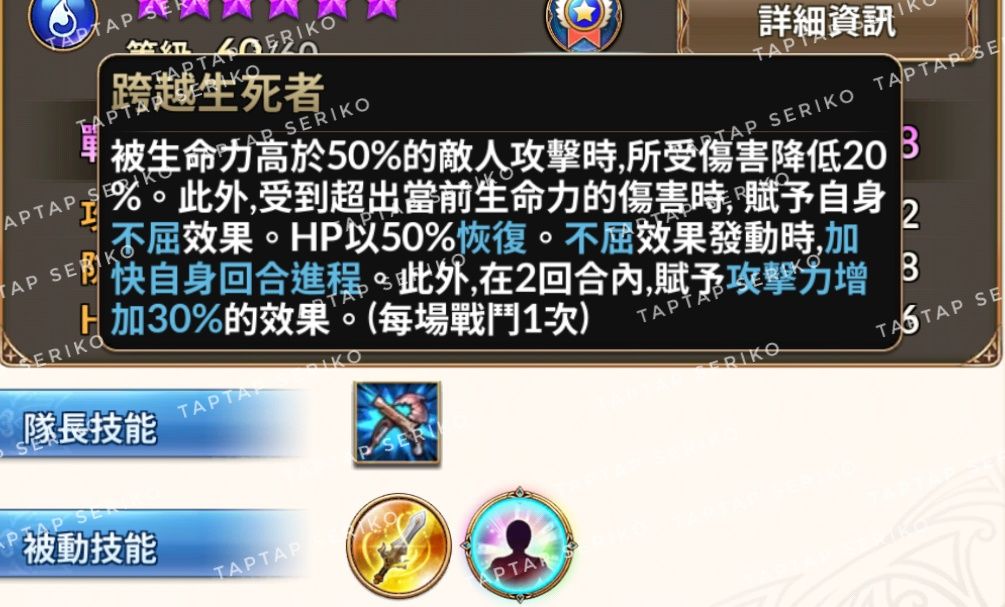 来看看满级数据,480%,85%无法屈服,这里给各位科普一下,这个游戏超过80%的概率,你就把理解成一定就可以了,很少发生不触发的情况。如果你没有把不屈的直接打死,一般是这种情况:这个不屈角色自己带了抵抗,无法屈服属于debuff,抵抗免疫debuff,就这么简单。