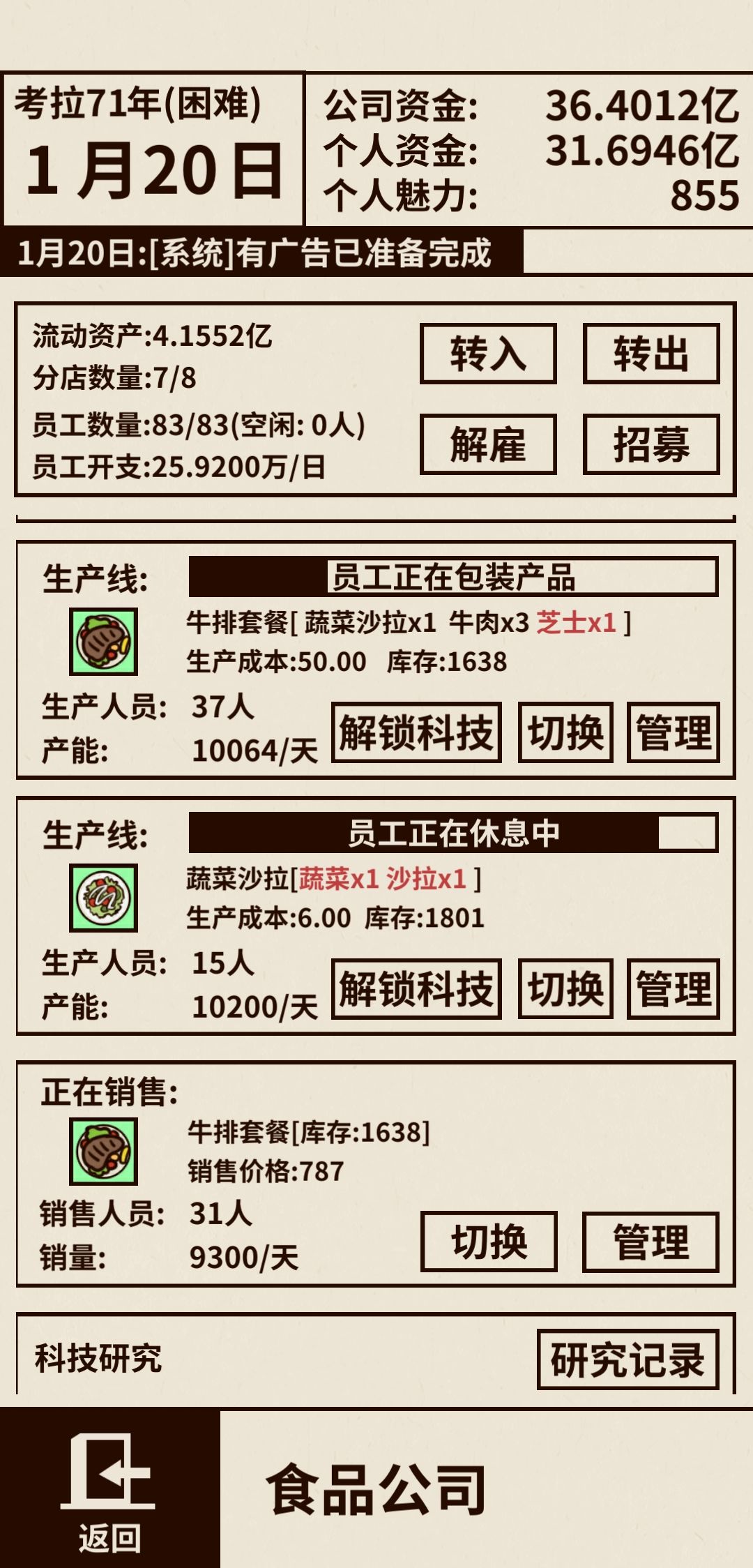 食品公司满级之后每次进去生产速度和销售速度都会变化