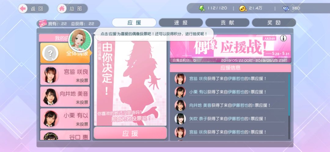 【活动内容】游戏中会大量产出应援券,您可以收集并为自己喜欢的偶像投票应援。投票结果将会分四次在游戏内公布。