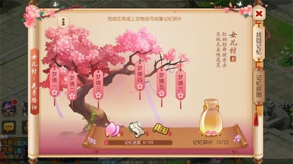 向来隐世而居的女儿村,从不对外人敞开大门。在一个满城飞花日,一位失去了记忆的神秘少女出现在了长安城。为玩家进入其梦境,帮她找回记忆的过程中,女儿村的神秘面纱也随之被挑落。人心与心魔,谁更难测?前尘尽忘的少女,又将何去何从?潜伏于三界的危机,能否得以解除?在女儿村正式降临后,玩家就将通过花寻路归任务,解锁六个梦境,寻找其中真相。