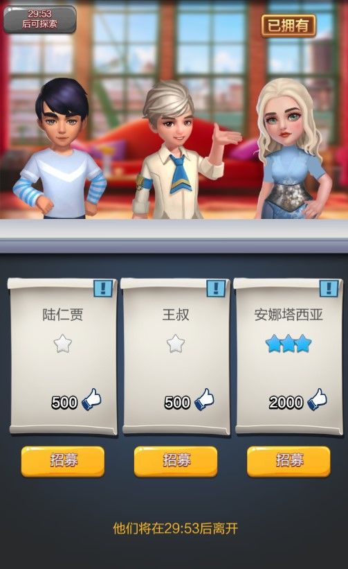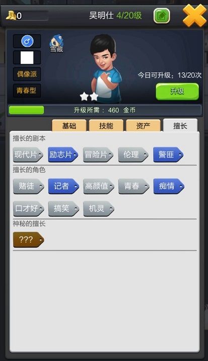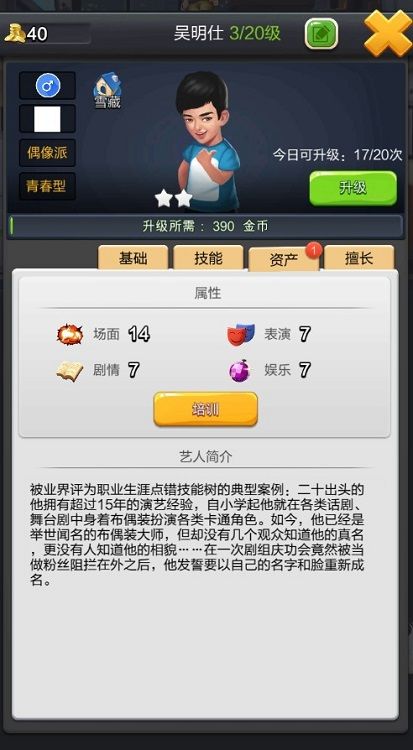 在星探界面花费少量金币雇佣星探进行探查,以发现可招募的艺人。星探探查后会给玩家一份1到3人的艺人清单,点击艺人可以查看艺人详情,包括简介,技能,擅长的电影类型等,喜欢哪一个艺人,就消耗一定的点赞数来招募吧。