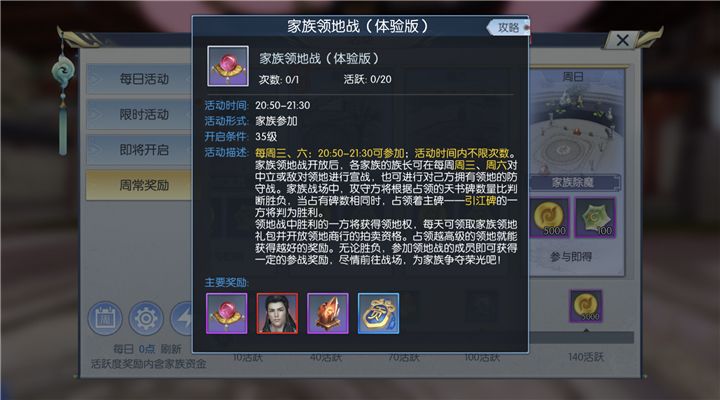 家族领地战是家族间的领地争夺,每周三和周六开启,家族可以对中立或敌对领地进行宣战,抢占领地,也可以选择对已占有领地进行防守。最终会根据家族所占领的天书碑的数量来进行判定领地归属。家族领地战中占领领地的家族将会能够每天享受该领地的领地礼包,并获得该领地的领地商行拍卖资格,其中领地商行中拍卖物品所得的金币将会以分红的形式分发给参与领地战的家族成员,所占领的领地等级越高,领地商行中的拍卖物品越丰富,所得金币分红也就会越多。家族领地战报名资格有限,奖励却是每天都会有的大量金币,所以道友一定要看好时间,积极参与才能有分红哦!