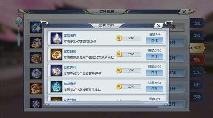 家族是《择天记手游》的基本组成单位,加入家族的道友不仅可以获得比较多的游戏伙伴一起逆天改命,还可以参加许多活动,奖励也会大大增加。而加入家族最直观的不同就是,道友在做一些活动时,可以有家族工资可以领哦。一周内参加一定次数的家族观碑、家族捐献、家族环线活动、神道穹顶、家族对诗和魔族奸细活动都将会有大量的金币可以领取,甚至每周在家族中说一句话就可以领取到金币!这些金币每周都可以领取,而且不需要参与多余的活动,只要道友日常活动积极参与就可以轻松拿到,是不是很容易呢!