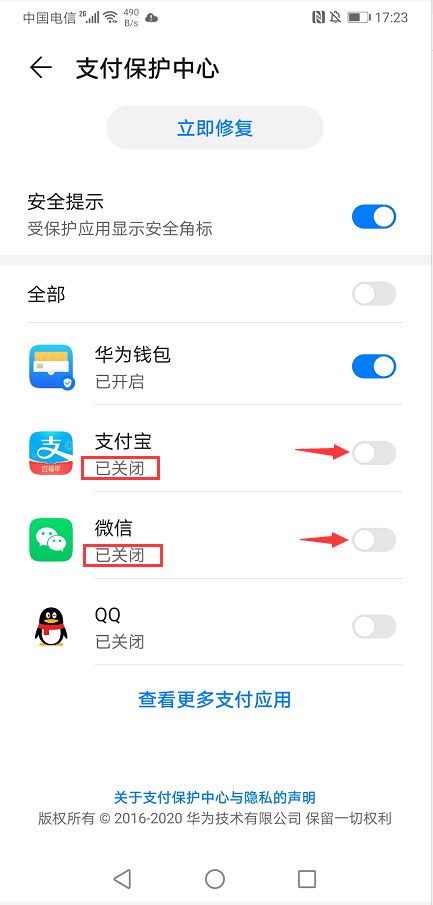 3、进入【支付保护中心】后,将“支付宝”及“微信”的支付保护按钮关闭