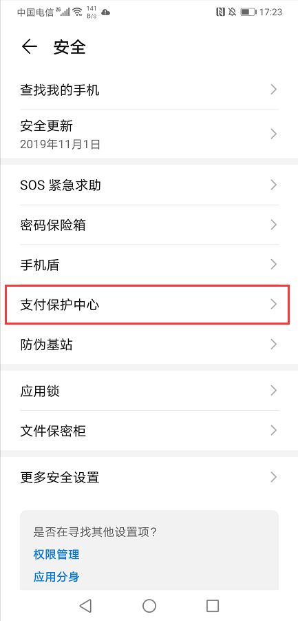 2、进入【安全】功能后,点击【支付保护中心】