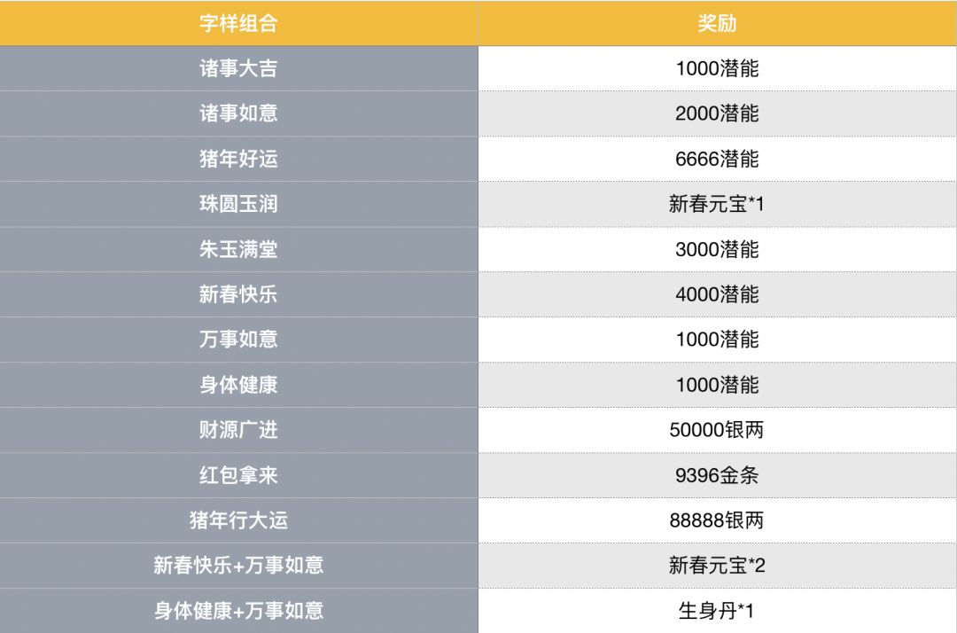 集齐指定字样可兑换如下奖励: