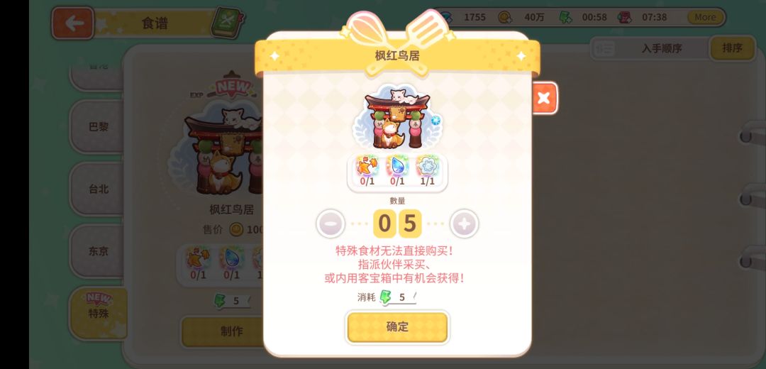 奇迹甜点食材获取途径:伙伴采买(指派至该城市采买)或内用客礼物