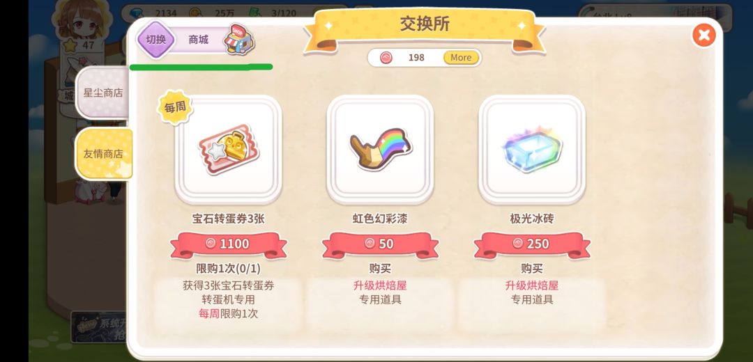 扩充甜品店需要彩虹道具(最开始不知道可以换,直接用钻买了,呜呜呜,两个180, 心好痛)建议在友情商店用友情点换彩虹道具 ,商场右上角切换交换所。