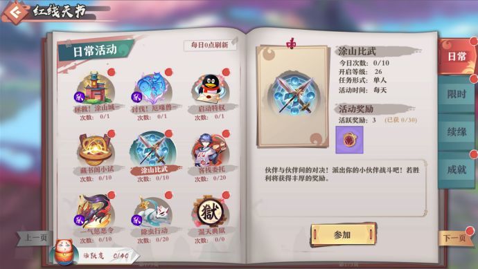 各位红线仙只需在“天书”的“日常”中,