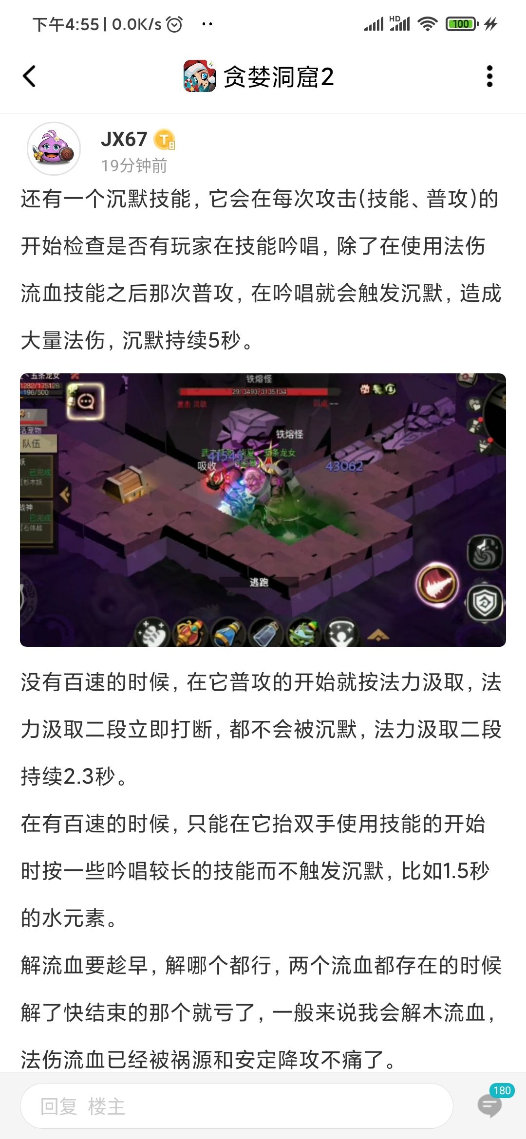 熟练了就可以在它抬手的同时你也同时举手放读条技能,久而久之,你会感觉读条沉默是根本不存在的。我打这个从来没有用过不屈冰弹加点,不过有几次尝试过用不屈火吞打死18。![[嗒啦啦2_滑稽]](https://img.tapimg.com/market/images/7103d7235af7e14b86822a4590d5bdfc.gif)