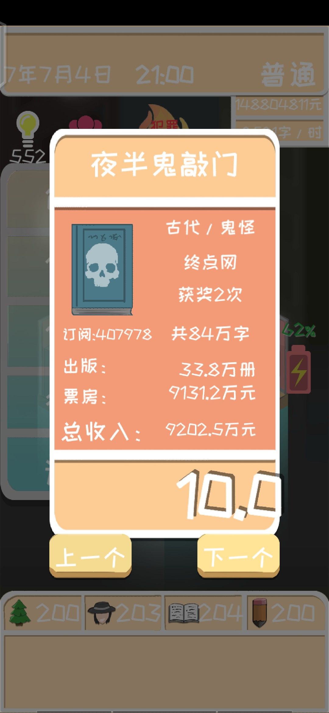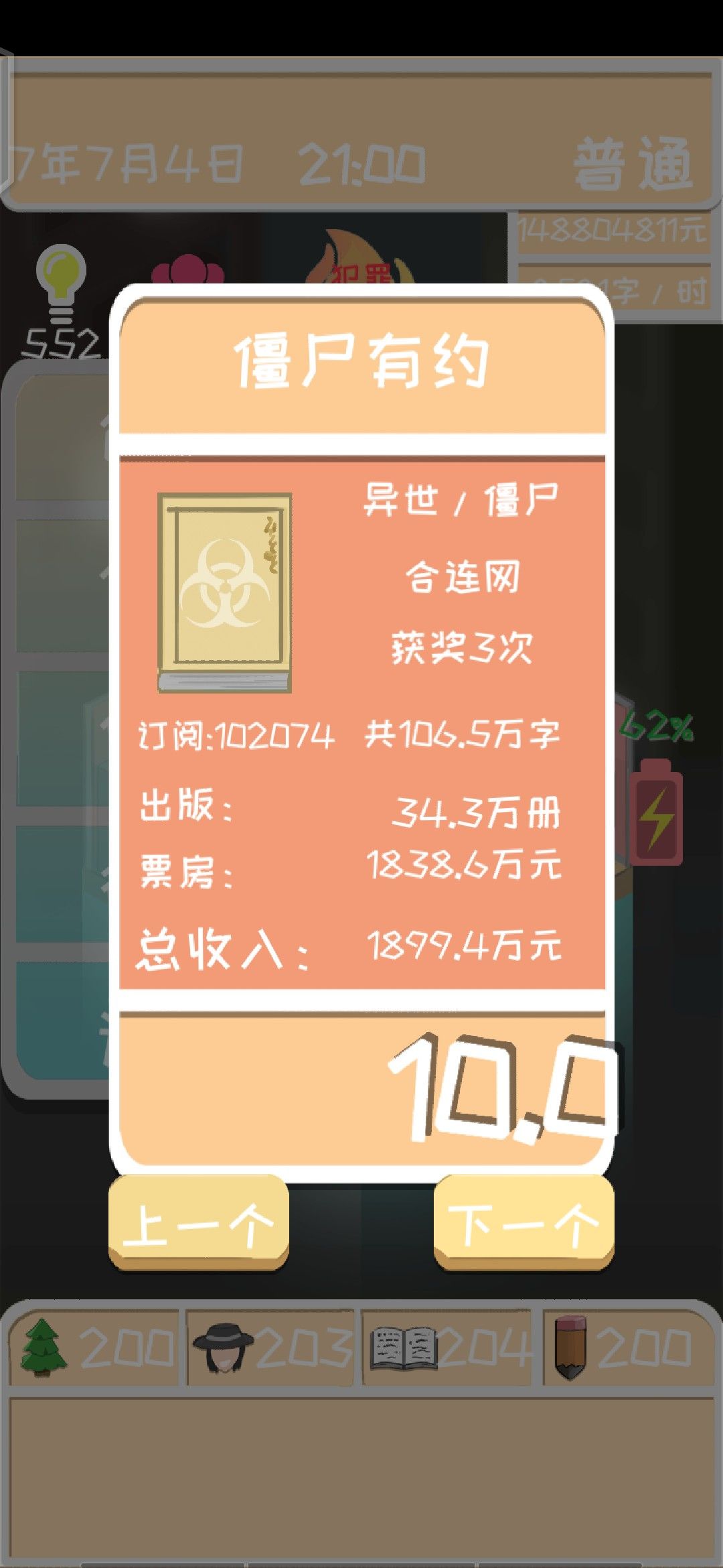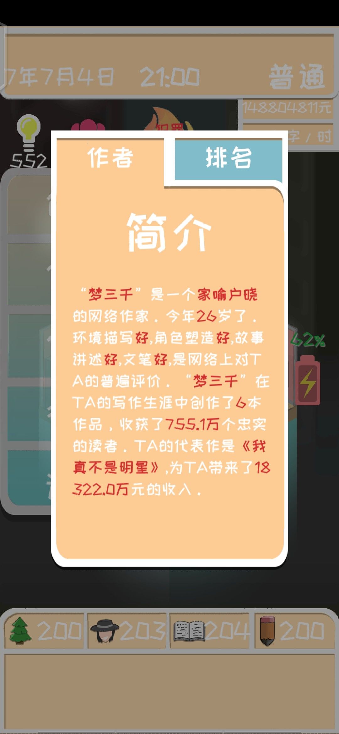 说说我对这个游戏的看法,就是那个过度动画真的是看吐了,画风太单一,玩法也有些单一。但是这个创意非常好,圆了我一个想做一个扑街作者的愿望。希望后面加一些成就系统之类的东西。在加一些随机事件。还有那个图书馆,电影院后面那个演唱会太耗体力了!!!